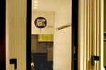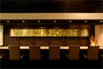 古い蔵を改装したカウンターの映える空間としました。正面のクラフトガラスを使った額で、閉鎖敵な空間で季節感を感じられるようにしています。