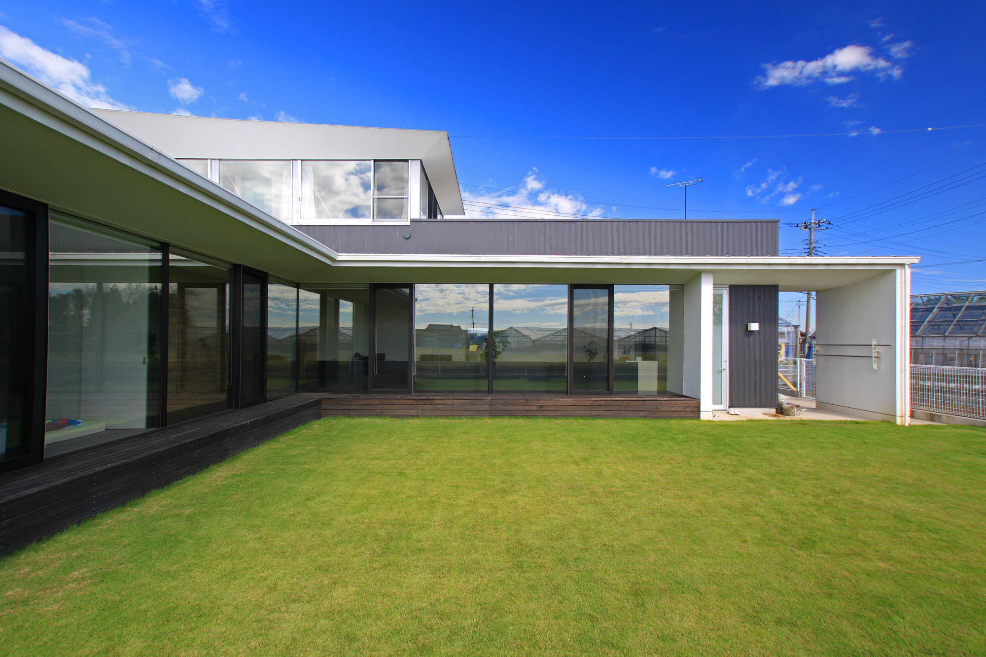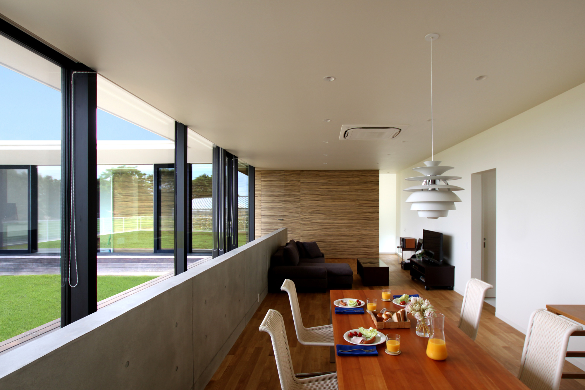 芝生の庭をL字型囲むように建物を配置し、周囲からの視線を感じない庭と一体的に広がる開放的な空間を目指しました。