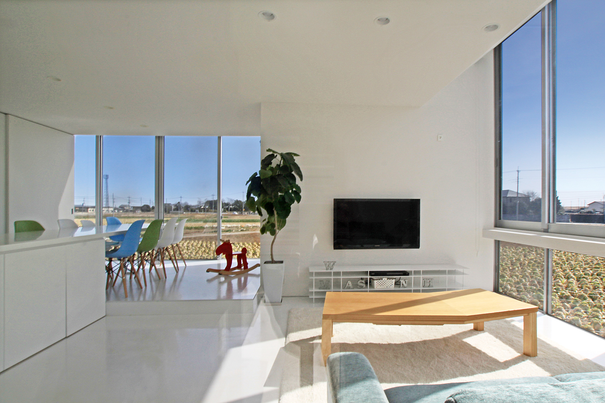 道路側を除く全ての方向に開放的な景色が広がる敷地ので中で、景色に寄り添い景色と共に暮らせる家を目指しました。